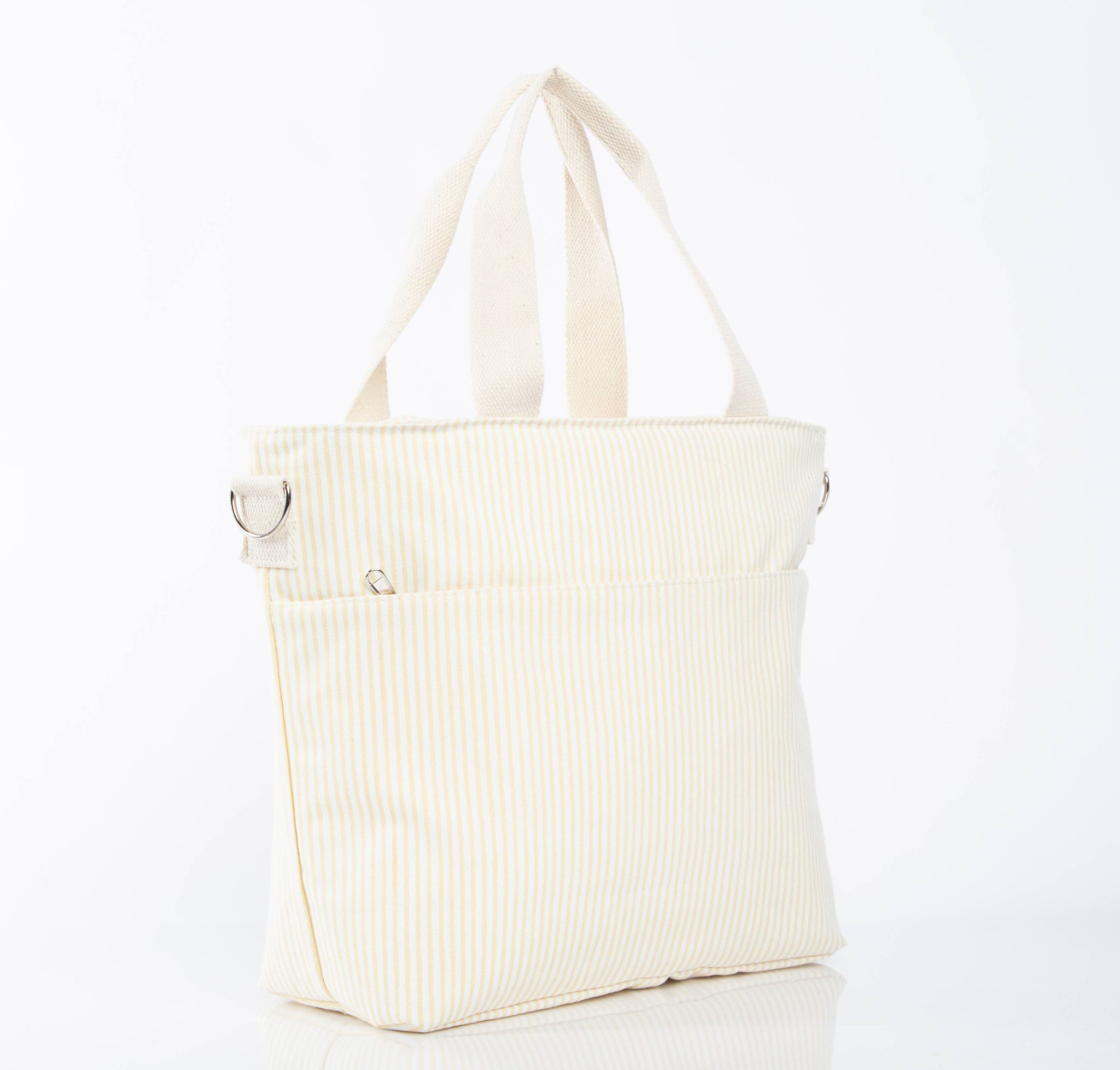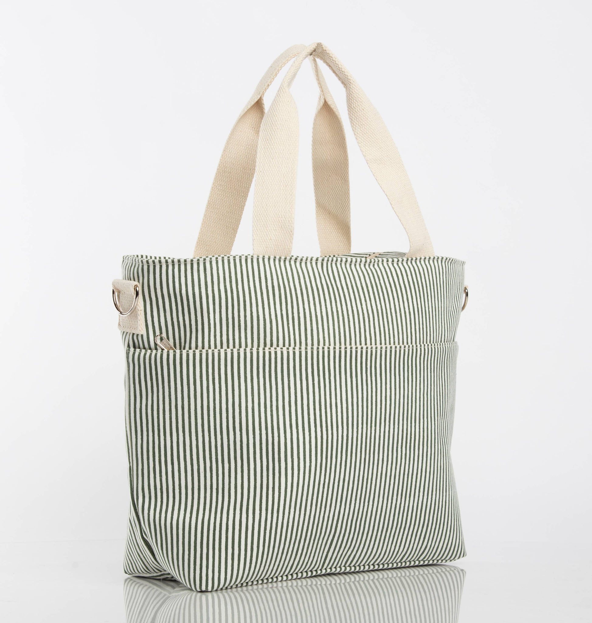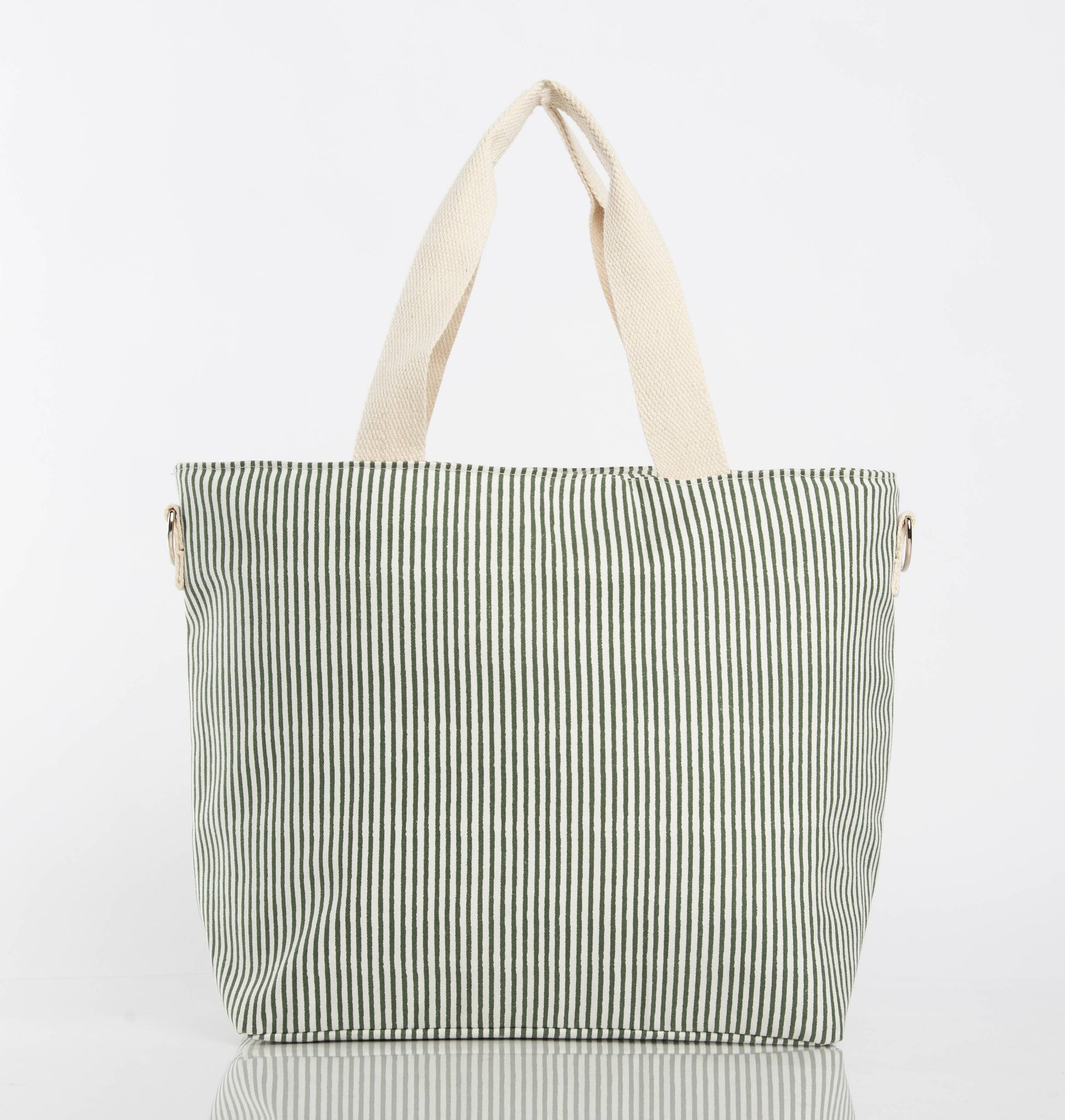 Our Striped Cooler Tote is perfect for those who lead an active and social lifestyle. The spacious size makes it perfect for carrying food and drinks to a variety of outdoor events, such as picnics, beach trips, or sporting events. Its stylish design makes it a great accessory for any outdoor outfit. Top zip closure with front exterior zip pocket. Webbed handles with an 8“ drop. USDA approved the insulated interior. Detachable shoulder strap that is adjustable. Materials: 12 oz Canvas Size: 12" H x 18" W x 5.5" D